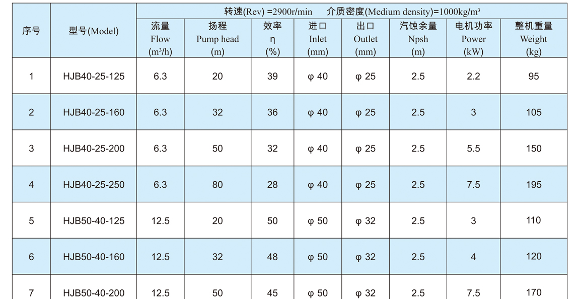 性能參數(shù)表(1):電機(jī)轉(zhuǎn)速2900r/min,表中流量揚(yáng)程加粗為額定參數(shù)