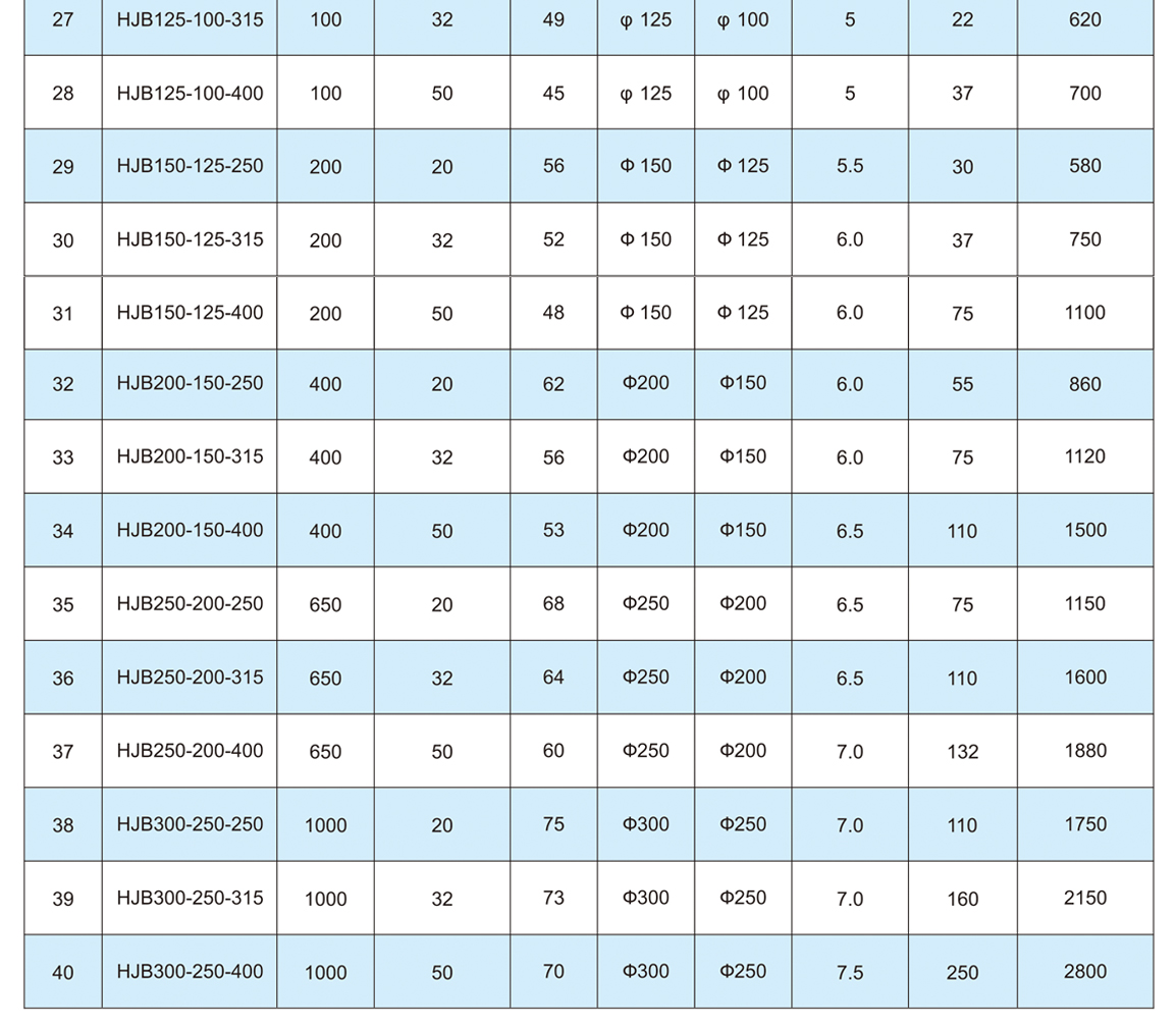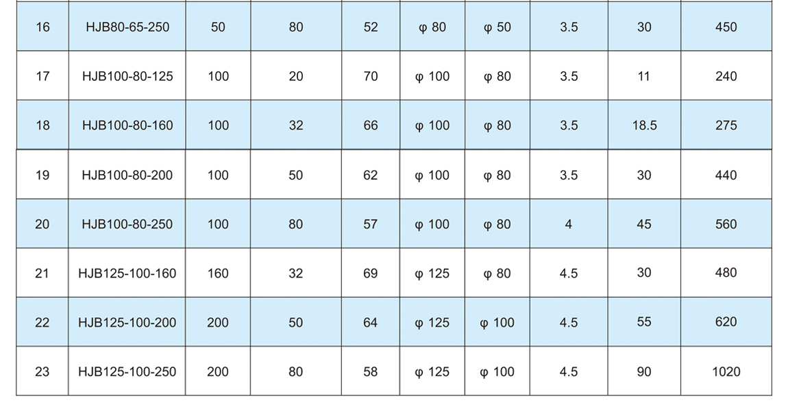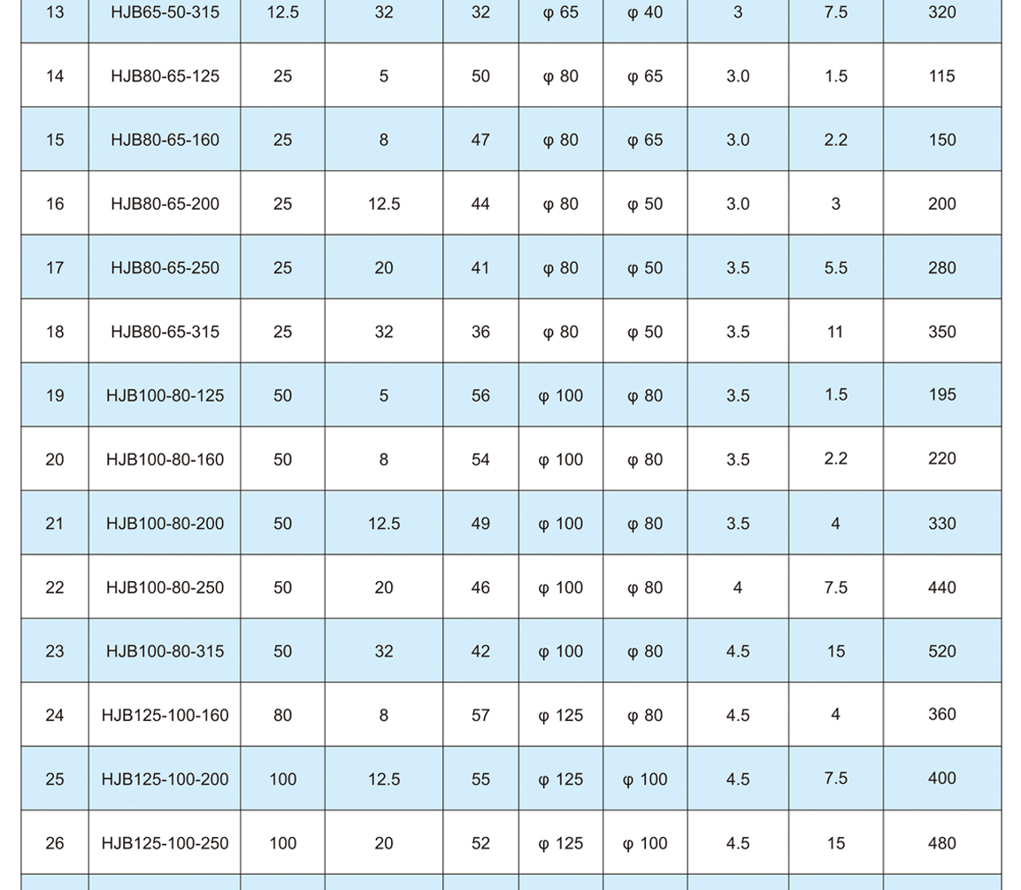 HJB:耐腐耐磨夾板泵代號(hào)丨80:進(jìn)口直徑80mm丨65:出口直徑65mm丨160:葉輪直徑125mm