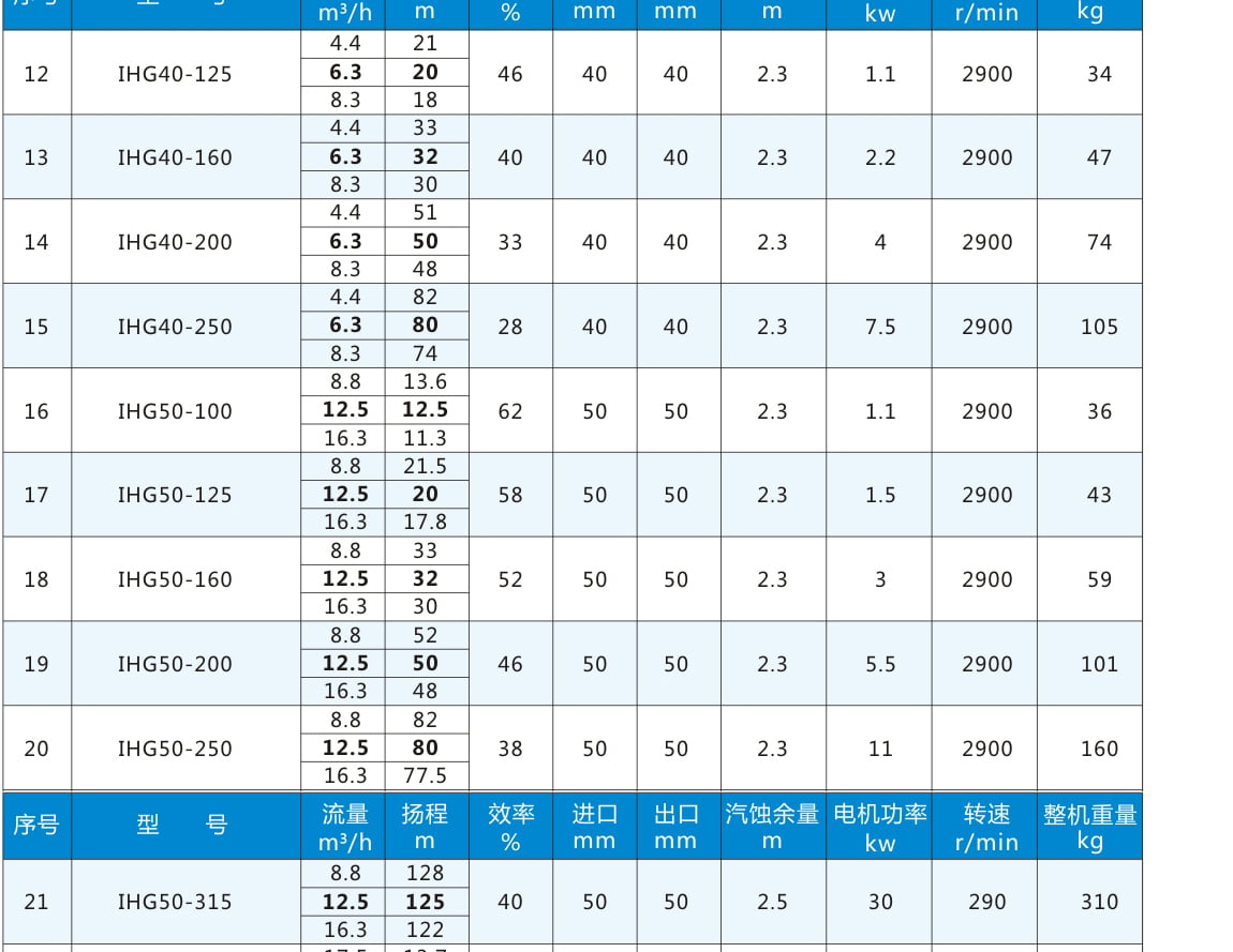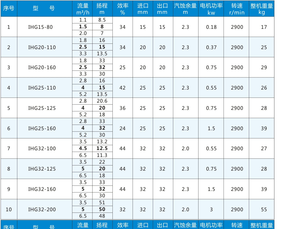 性能參數(shù)表:電機轉速2900r/min,表中流量揚程加粗為額定參數(shù)