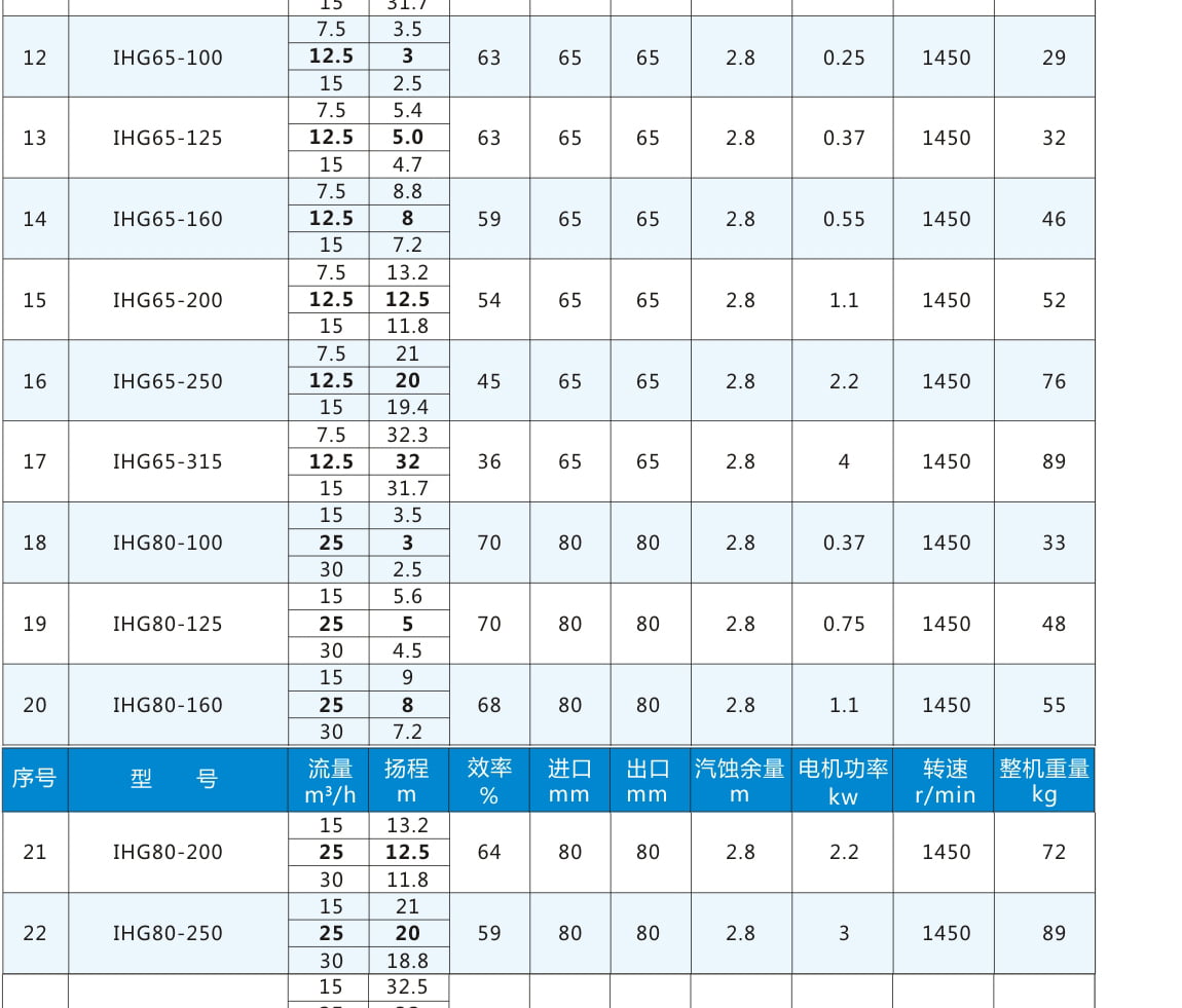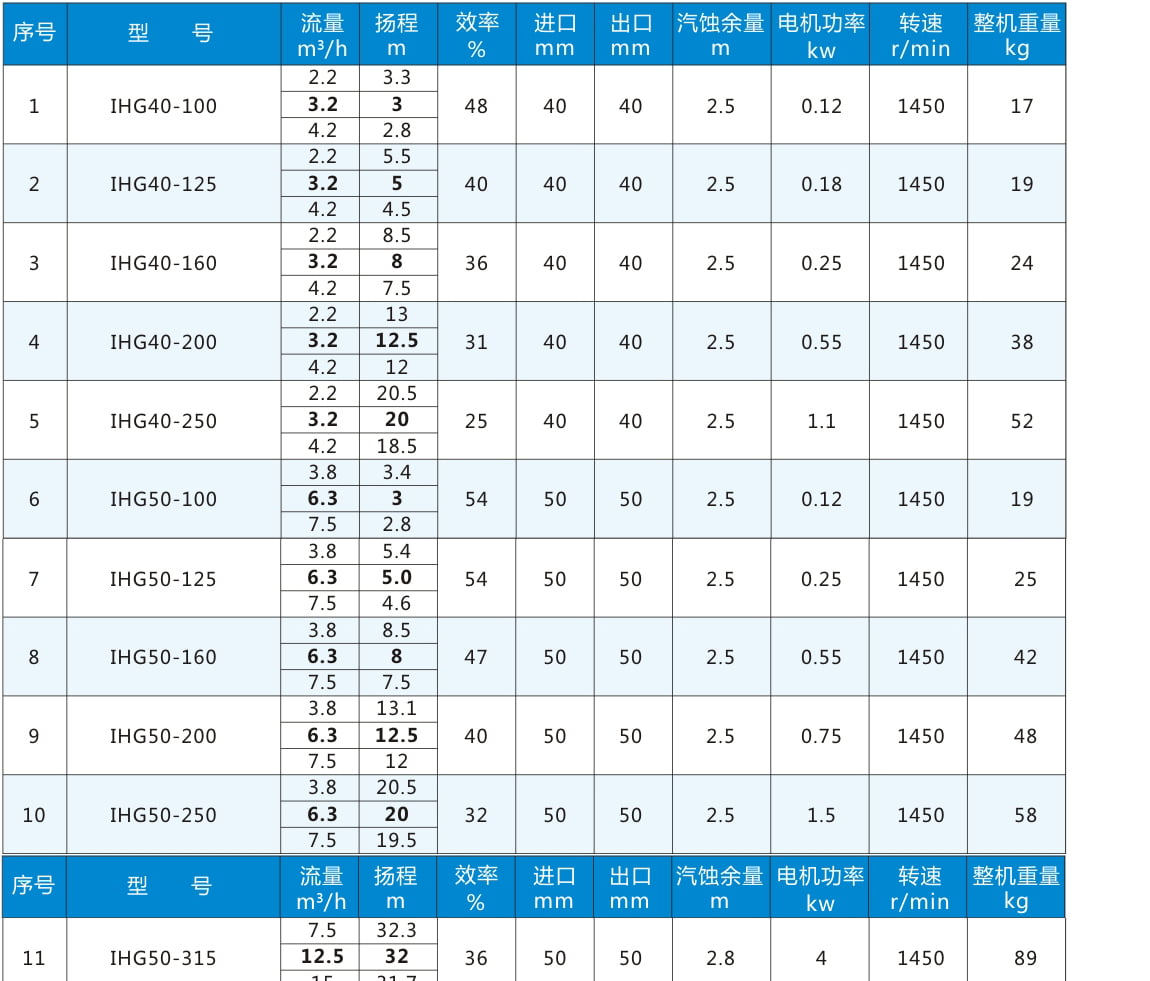 性能參數(shù)表二:電機轉速1450r/min,表中流量揚程加粗為額定參數(shù)