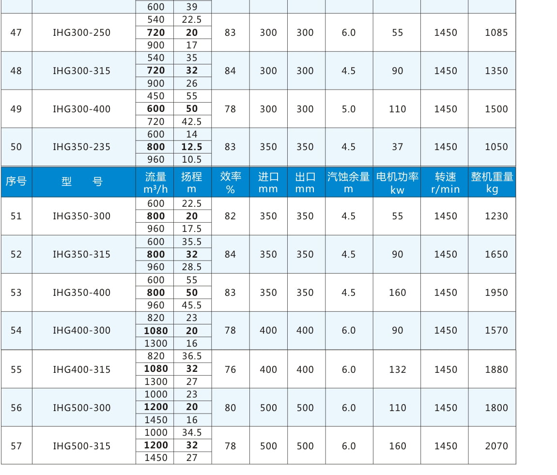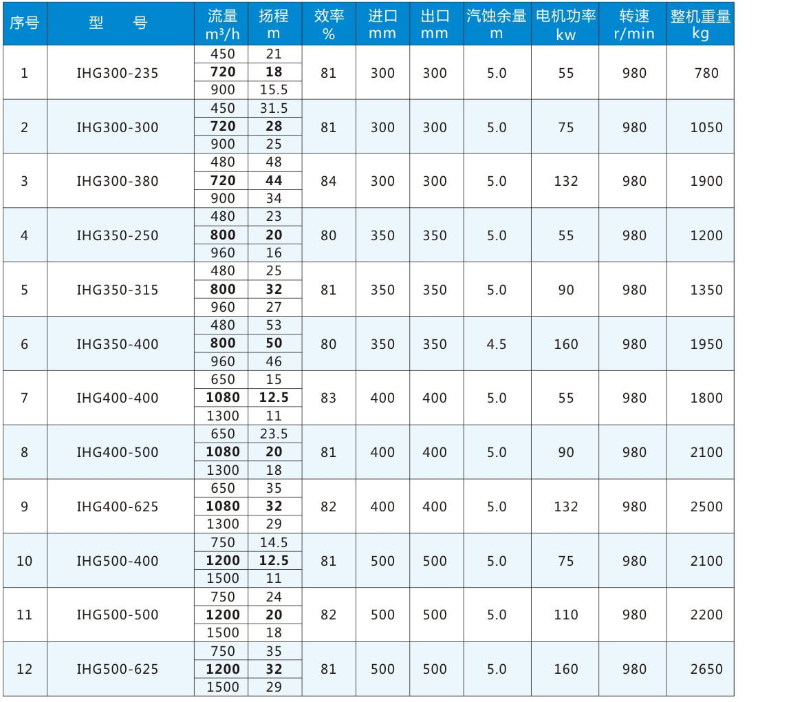 性能參數(shù)表三:電機轉速980r/min,表中流量揚程加粗為額定參數(shù)